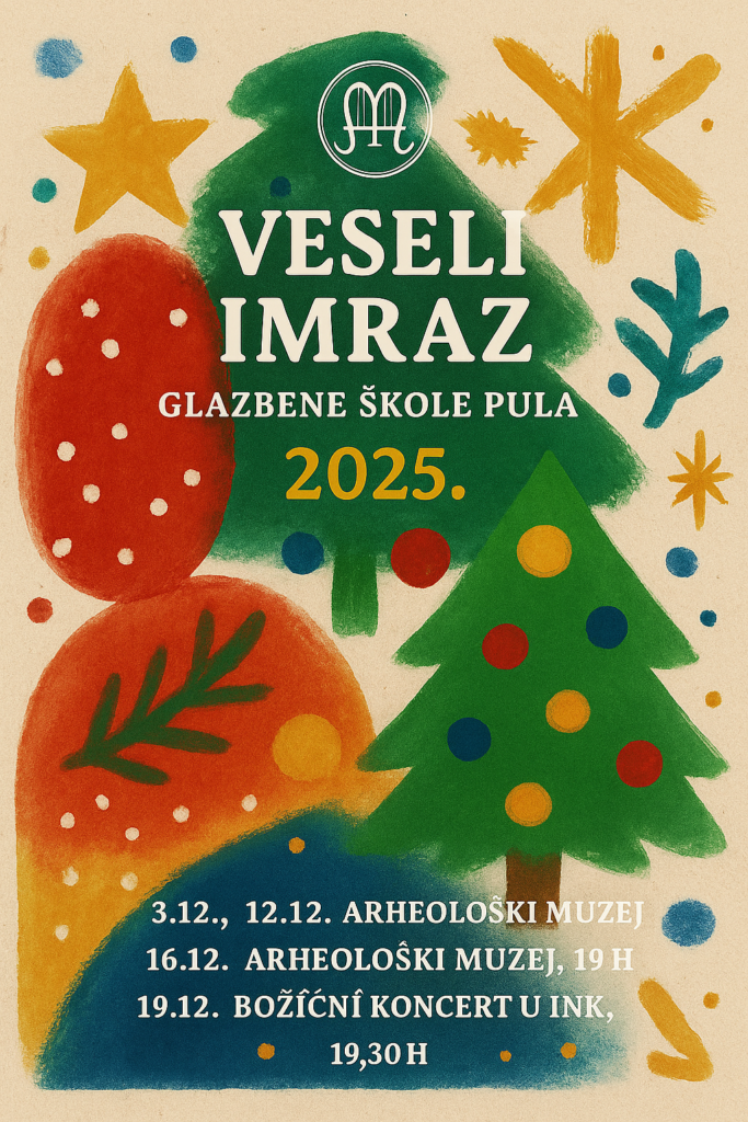 Sa zadovoljstvom najavljujemo blagdanske koncerte koji će svojom glazbom obogatiti prosinačko razdoblje . Ovim putem zahvaljujemo našim suradnicima i ravnateljima na ustupanju dvorana za koncertna izvođenja. Svaki nastup predstavlja važan korak u umjetničkom razvoju mladih glazbenika, stoga vas pozivamo da svojim dolaskom podržite naše učenike, koji predano rade na svom glazbenom putu, kao i njihove nastavnike.