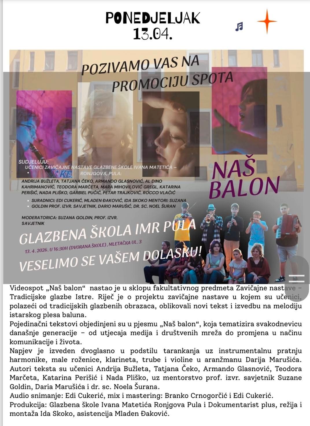 U punoj dvorani Glazbena škola Ivana Matetića Ronjgova Pula održana je promocija videospota „Naš balon“, jednog od središnjih događaja ovogodišnjih Dana škole.